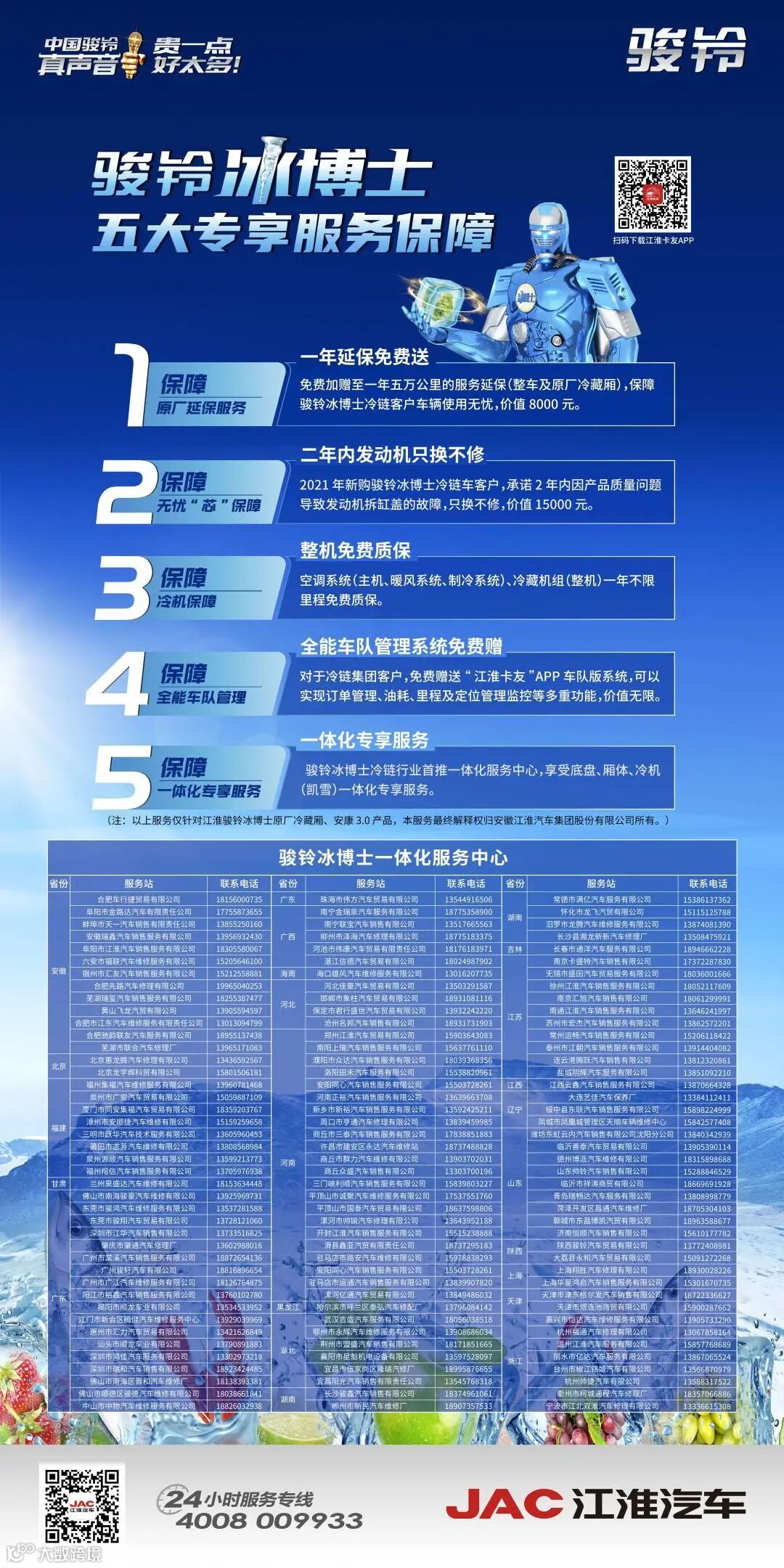 (以上服务仅针对江淮骏铃冰博士原厂冷藏厢、安康3.0产品,本服务最终解释权归安徽江淮汽车集团股份有限公司所有)