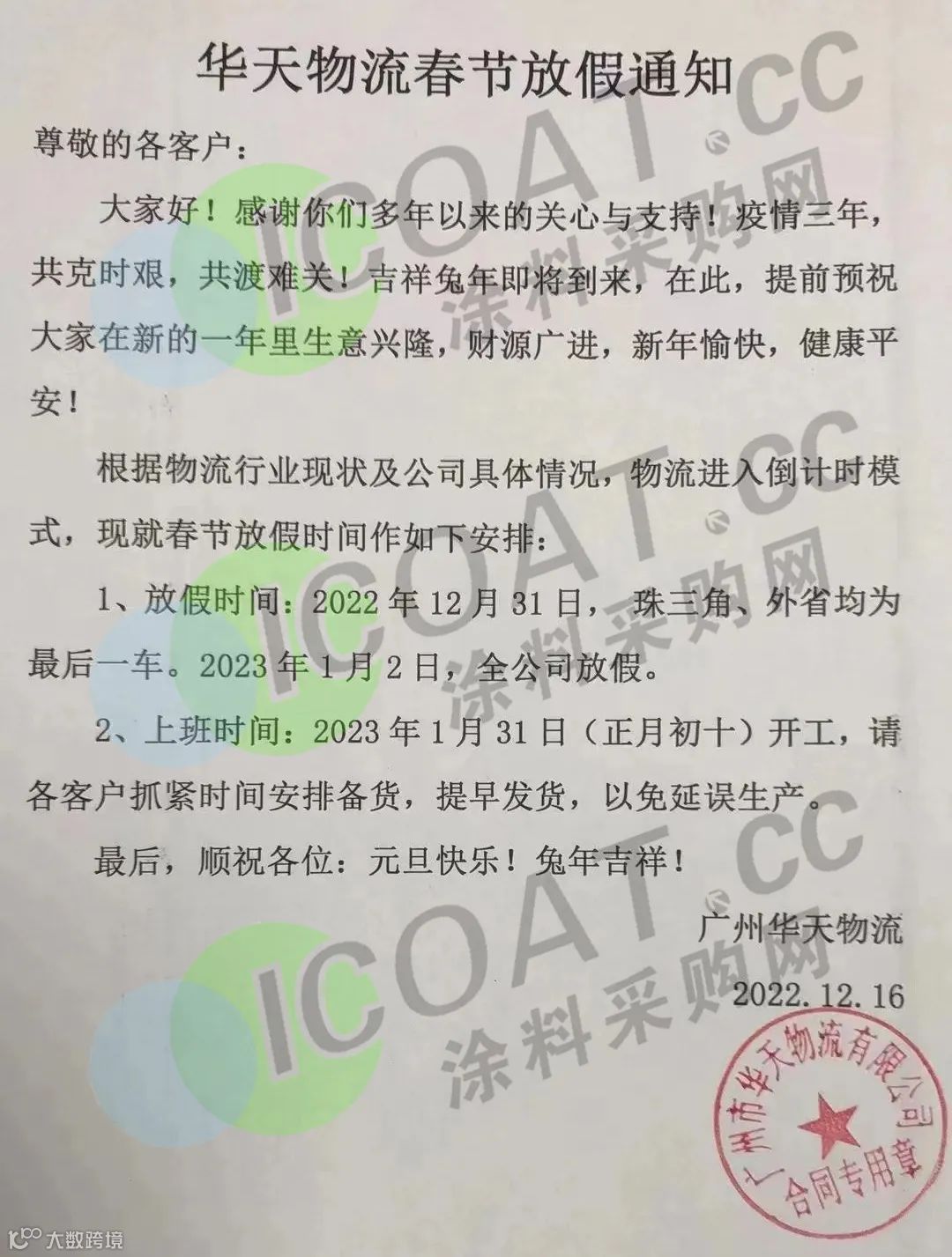 广州华天物流:放假时间为2022年12月31日,珠三角、外省均为最后一车。2023年1月2日全公司放假。2023年1月31日开工,请各客户抓紧时间安排备货,提早发货,以免延误生产。