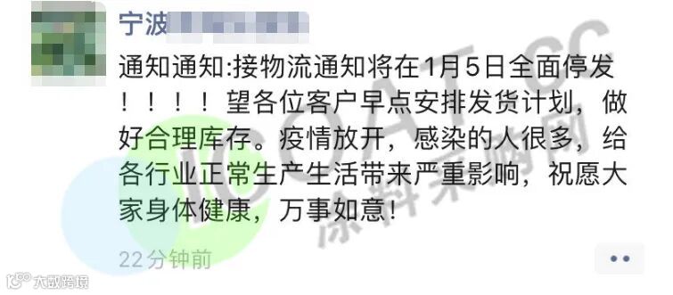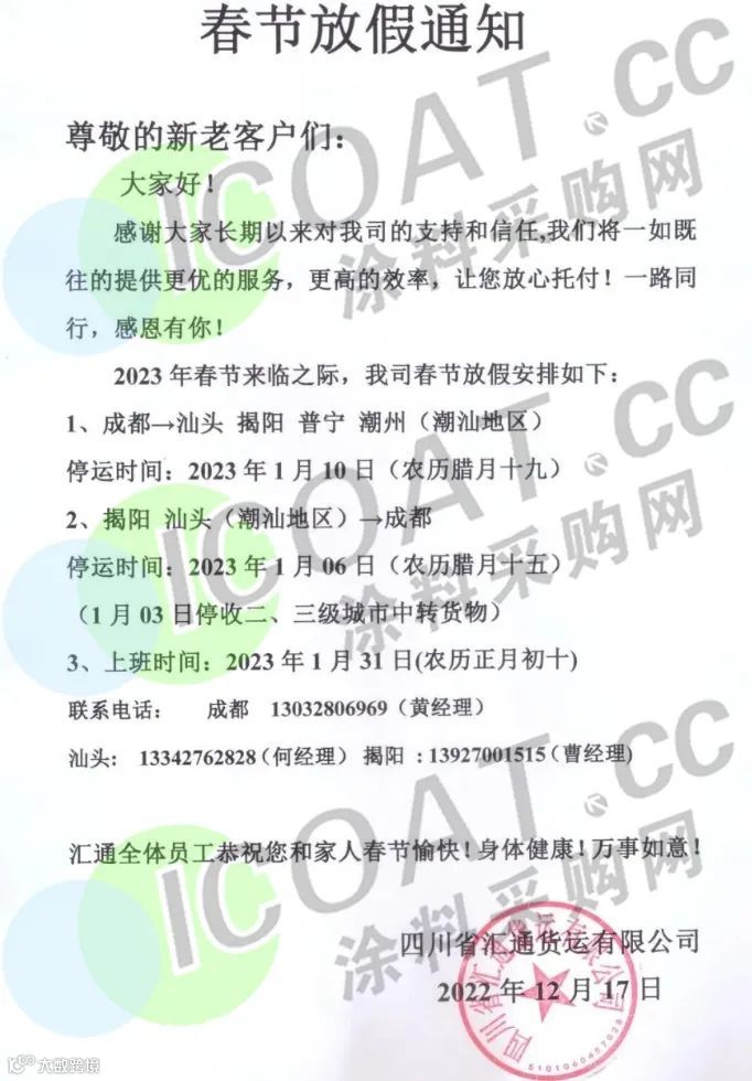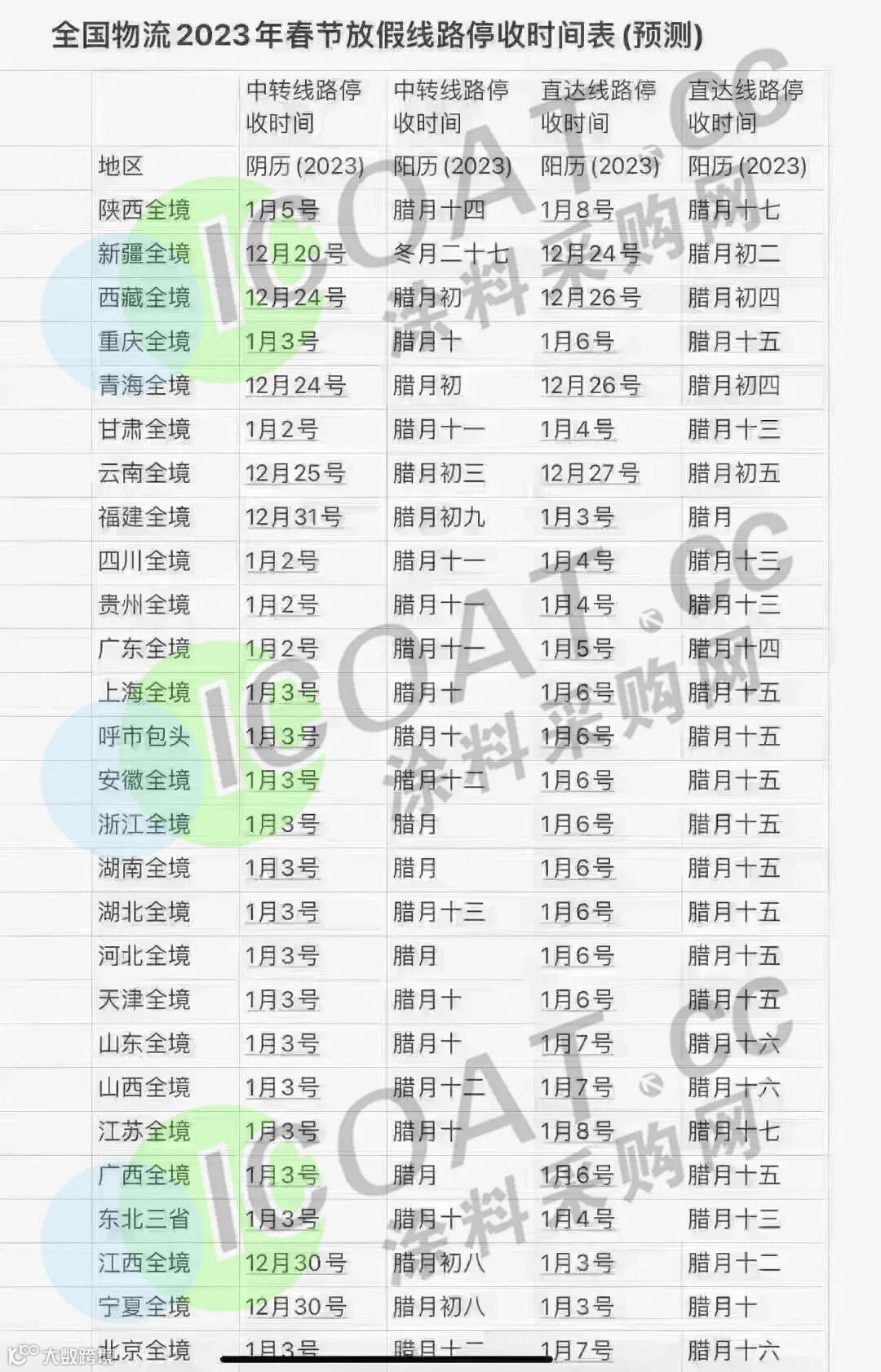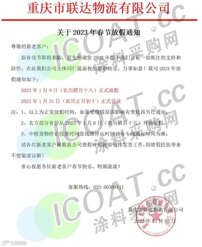 重庆市联达物流:2023年1月9日正式放假,1月31日正式营业,北方部分省份从1月6日开始放假,中转货物停止收货时间及线路停运时间以各专线通知时间为准。