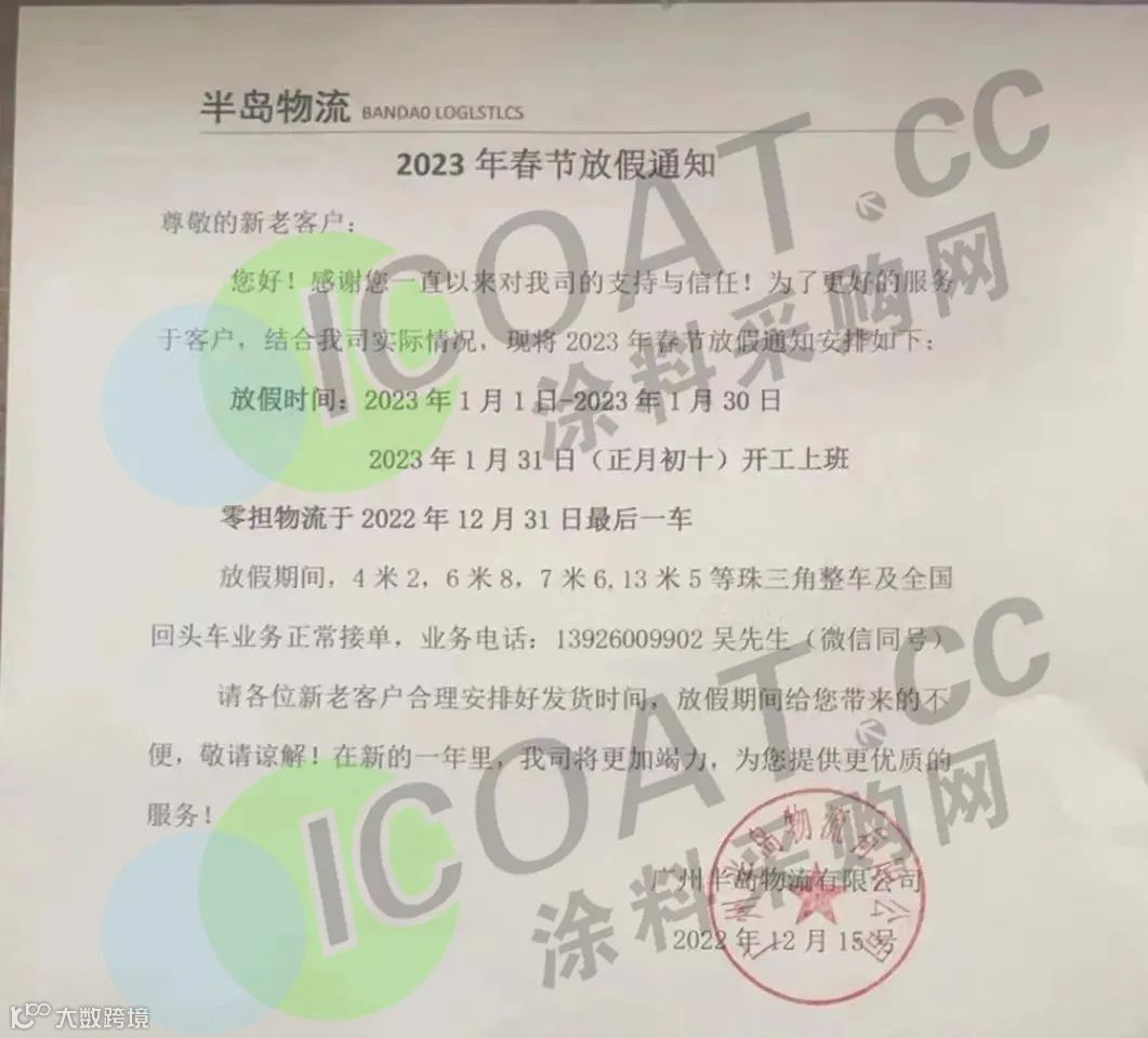 尽管历年的放假基本都是从1月开始,但今年疫情肆虐,阳性感染者暴增,多个行业开开停停之下也选择了放假的选项,以解决成本高企等问题。小编提醒广大经销商、农资店及种植户朋友们提前合理备货,以免出现货源短缺或订单延误等情况。(来源:涂料采购网)