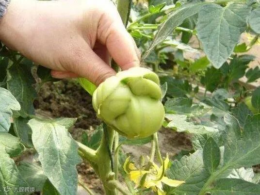 番茄上较易出现,开始表现为花的萼片数增多,结出的果实颜色变浅、变小,并且开裂或成为多头果,似聚在一起的小果。