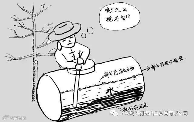 例如可湿性粉剂、粉粒往往团聚在一起成为粗团粒,如果直接投入药水箱中一次配液,则粗团粒尚未充分分散即沉入水底,此时再进行搅拌就很困难。如果直接采用一次稀释,农民朋友因为打药时搅拌不够均匀,药液在喷雾器中没有完全分散开来,导致有的地方浓度高、有的地方浓度低,不利于均匀喷雾。这也是所有企业,包括制造工艺非常高的外企,也在提倡二次稀释的原因。