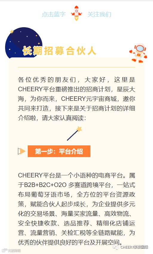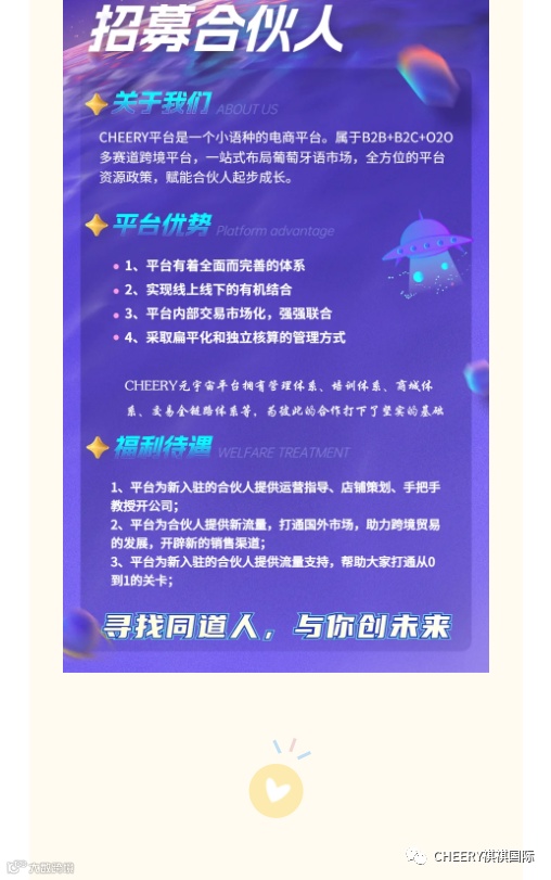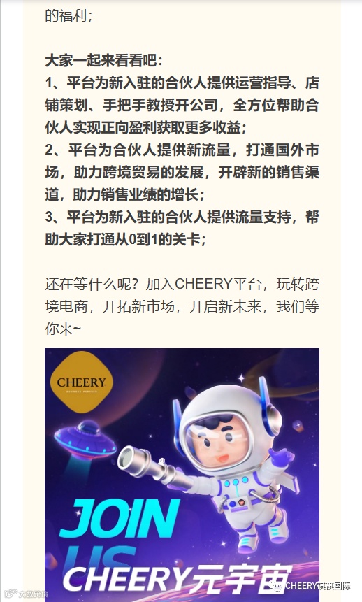 导读:加入CHEERY平台,玩转跨境电商,开拓新市场,开启新未来,我们等你来~