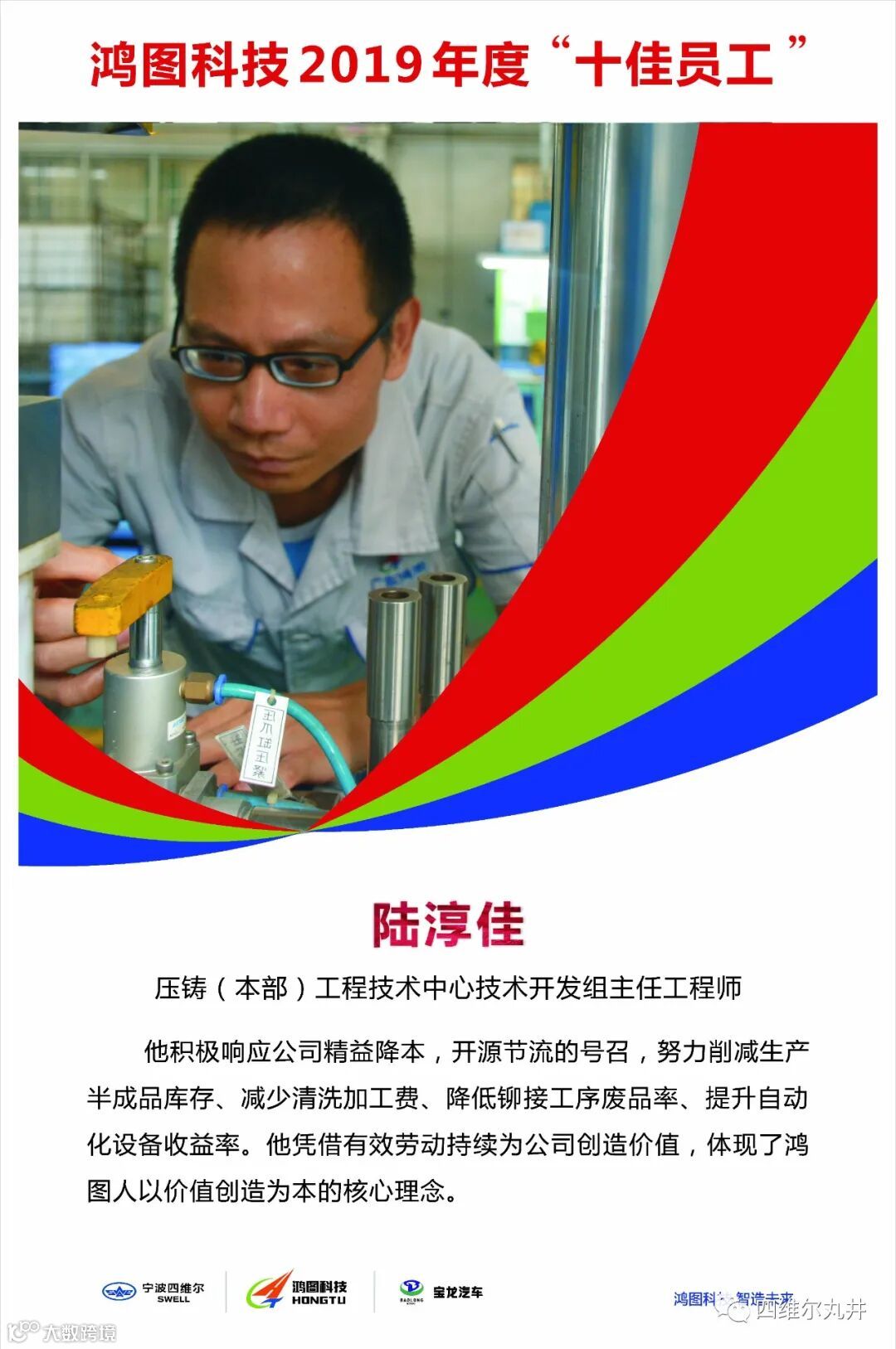 他积极创新、专业专注,凭借有效劳动持续为公司创造价值,体现了鸿图人以价值创造为本的核心理念。