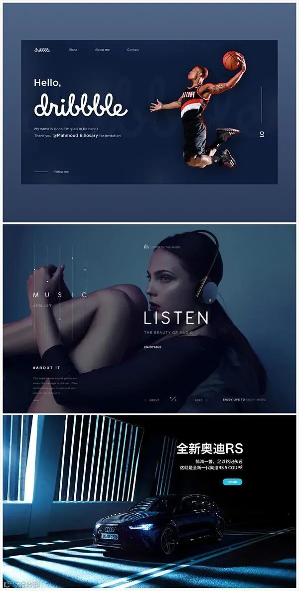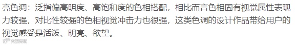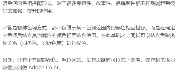 暗色调:泛指低明度的配色搭配,相对前两者而言,暗色调给人的视觉感受更稳重、有品质感。