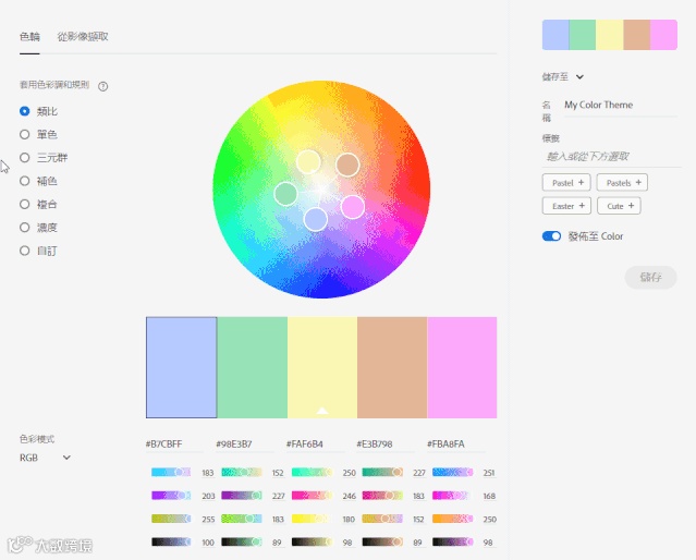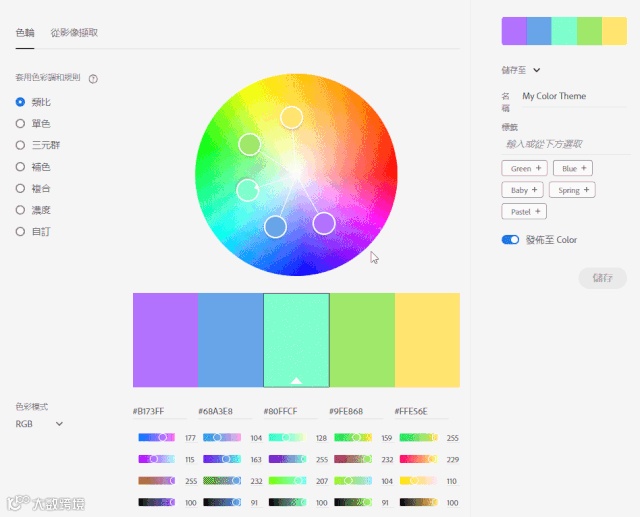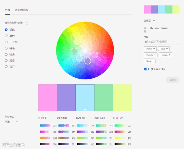 功能远不止这些,还可以变换色彩调和规则、改变色彩模式、从图片中提取色彩等等,只需简单操作,就会有无数种不同的配色方案供你参考、选择。
