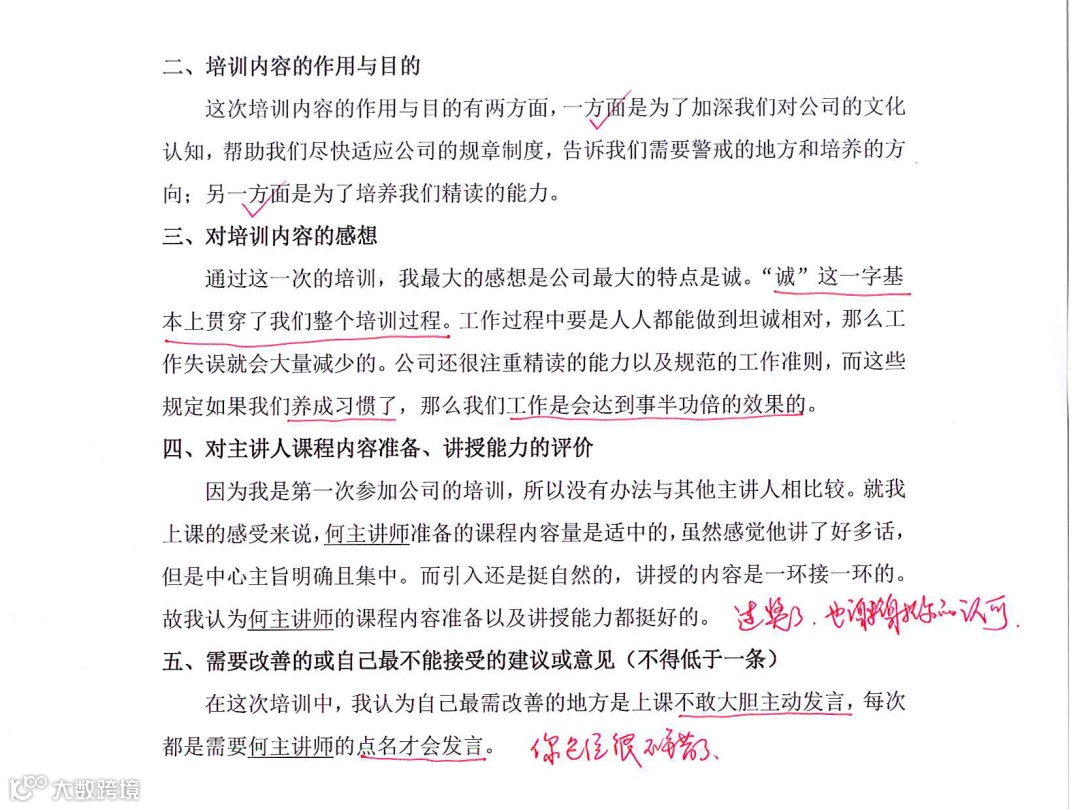 1. 作为一个新入职的成员,能严格按照“会培考”的要求来写总结,是很好的纪律性和个人能力的体现,完美的体现了培训中所希望达到的目的/目标。