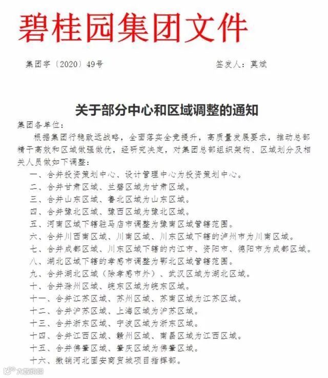 在这份文件中,碧桂园的组织构架剧烈收缩,不少机构都出现了合并的现象。甚至河北固安商贸城,直接撤销!