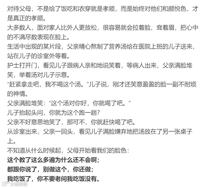 试着回想一下,儿时,父母对我们的幼稚从未表现出不耐烦;而现在,父母总对我们的脸色不知所措。