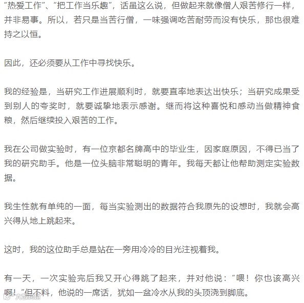 他用鄙夷的眼神看着我,说:稻盛,说句失礼的话,值得男子汉兴奋得跳起来的事情,一生中也难有几回。但看你的样子,动不动就高兴得手舞足蹈,现在甚至叫我也要同你一起高兴,我是说你轻薄好呢,还是轻率好呢?总之,我的人生观与你不一样。