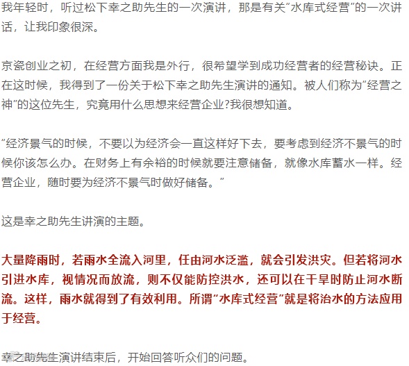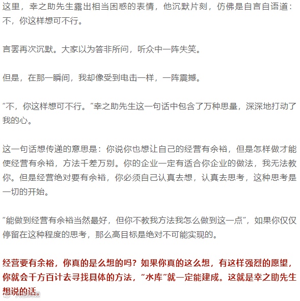 后面有人举手提问:先生所讲,就是经营必须有余裕,我理解了。但是这层意思,松下先生即使不讲,我们中小企业经营者也都明白。正因为我们做不到这一点,才感到苦恼。怎样才能让经营有余裕?如果不教我们具体的方法,我们很难办。