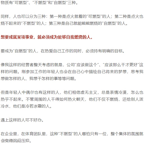 我希望同事们都是自燃型的人,不用“点火”,他们也会自动燃烧。至少,当燃烧的我接近时,他们是能同我一起燃烧的“可燃型”的人。