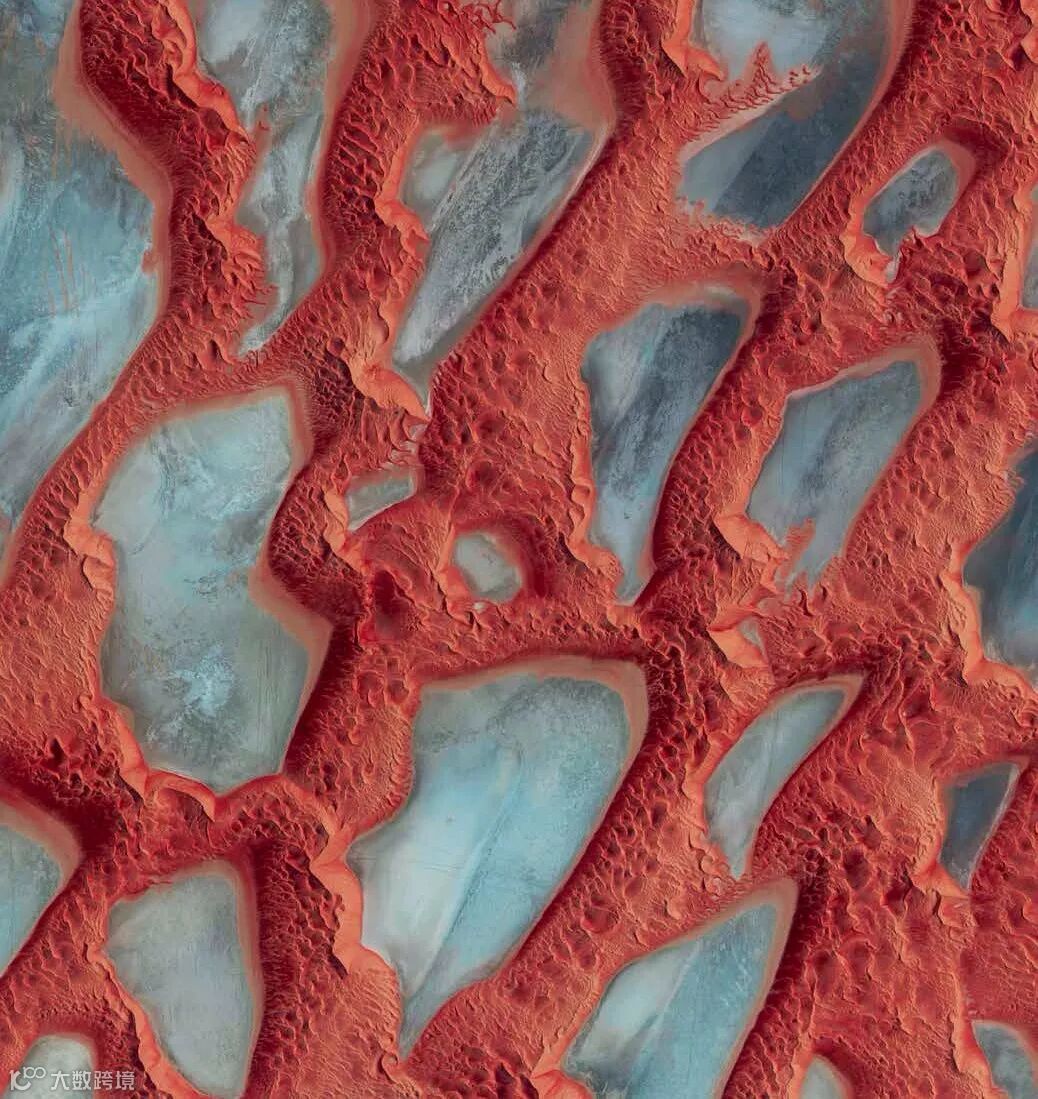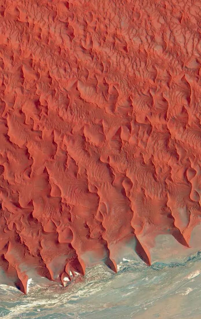 索苏斯盐沼,位于纳米比亚纳米布沙漠边缘。图中北部的那些红色沙丘, 很多高度都超过了 200 米,是世界上最高的沙丘。