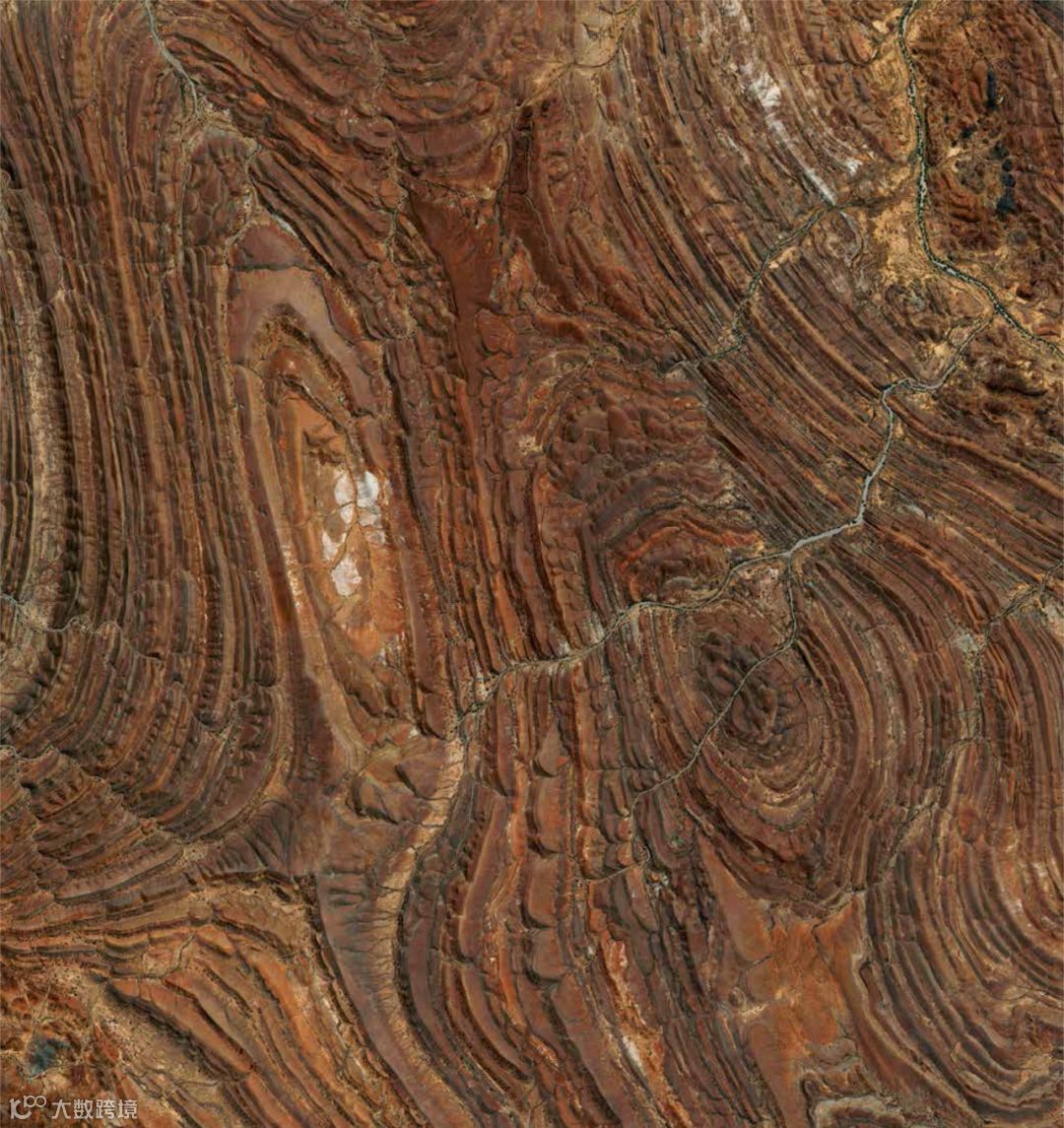图中错综复杂的地质构造位于南澳大利亚内陆,那些漩涡状的图形是由5.4 亿年前巨大盆地中沉积物形成的,陆地发生褶皱和断裂成为山脉, 在受到大面积侵蚀之后,海拔高度下降,变成了我们今天见到的样貌。