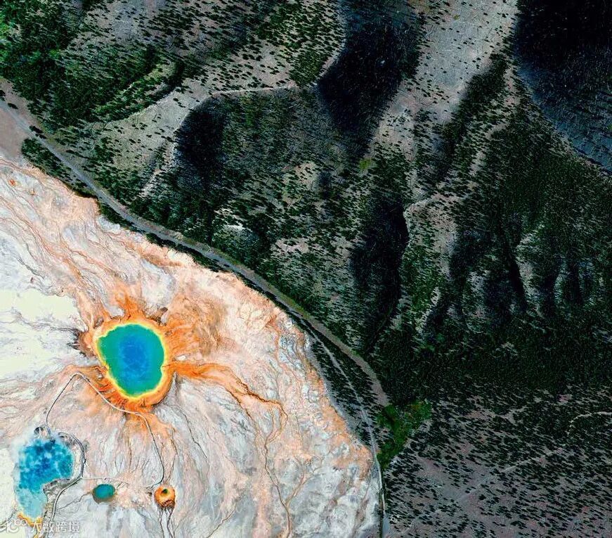 美国怀俄明州黄石国家公园。游客们可以在栈道上面近距离观赏温泉景色。由于温泉水富含矿物质,池边生长着含有色素的细菌,使得温泉呈现出鲜艳 的色彩。