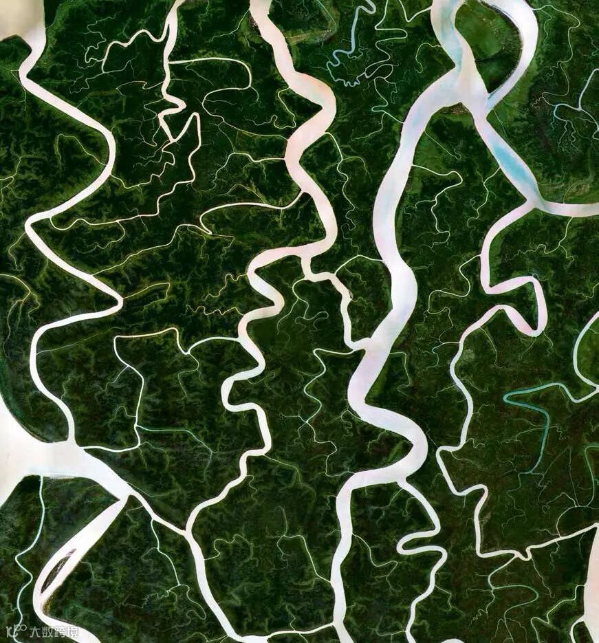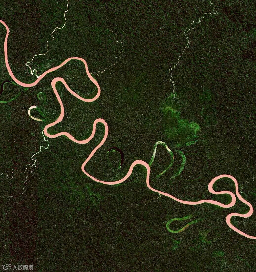 里约马德雷德迪奥斯河蜿蜒流淌在秘鲁热带雨林中。牛轭湖——主河道延伸出来的 U 型分支,当主河道的河水被截断后,形成了一片形状不规则的水域。