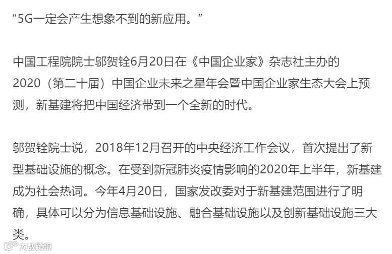 “5G一定会产生现在还想象不到的新应用。”邬贺铨说。