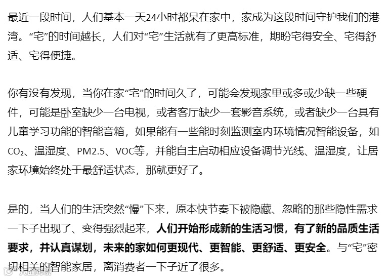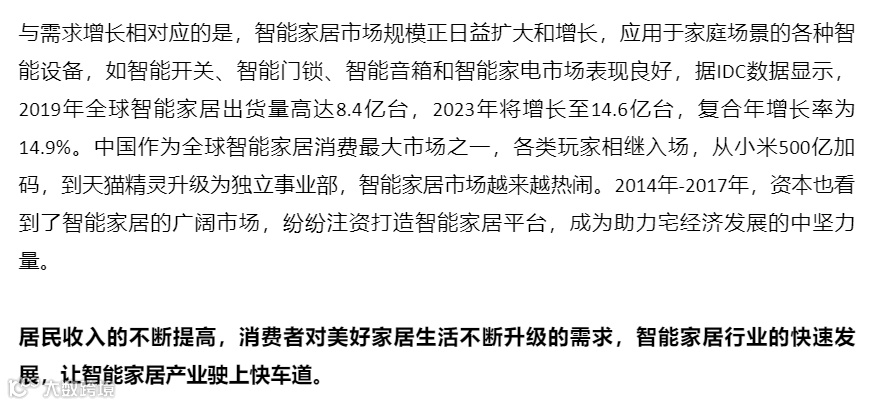 在炎热的夏天提前开启空调;出门不用担心忘带门禁卡、钥匙;家中烟雾探测器、门磁探测器报警后会自动联系业主及物业;智能摄像头抓拍到异常事件、异常行为人员会自动报警通知物管……让生活变得更好,体验更加便捷,舒适,安全的家居环境是智能家居爆发的底层逻辑。