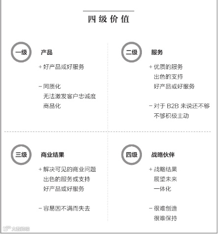 这一级是商品层面的最高价值。也就是说,你有一个电子表格,里面清清楚楚地用数字列出你能创造的价值和客户的投资回报,但你的竞争对手也有一个这样的表格。而客户公司的采购部门有他们自己的电子表格,他们会把各个供应商的报价填到里面,谁的价格最低一目了然。在其他条件都相同的情况下,客户以价格为标准做出决定没什么不对。