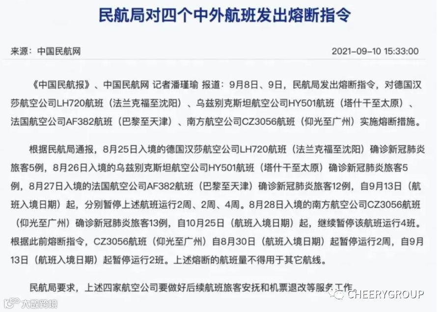 Five infected passengers were detected on flight LH720 arriving in Shenyang on August 25 after checking the relevant flight circuit breaker notice issued by the Civil Aviation Administration of China. The circuit breaker is two weeks as stipulated.