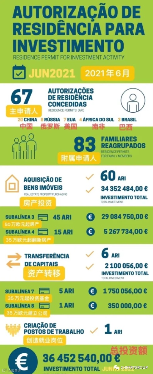 日前,葡萄牙移民局发布了6月份的黄金签证数据。截至2021年6月,葡萄牙黄金签证共签发9834位主申请人,总投资额高达58.7亿欧元。当月全球获批总人数150人(获批主申请人67人,附属申请人为83人),总投资额3645万欧元。从主申请人的国籍来看,来自中国的投资者为20位,继续保持着优势。其次是俄罗斯(8位),美国(7位),南非(4位),巴西(3位)。