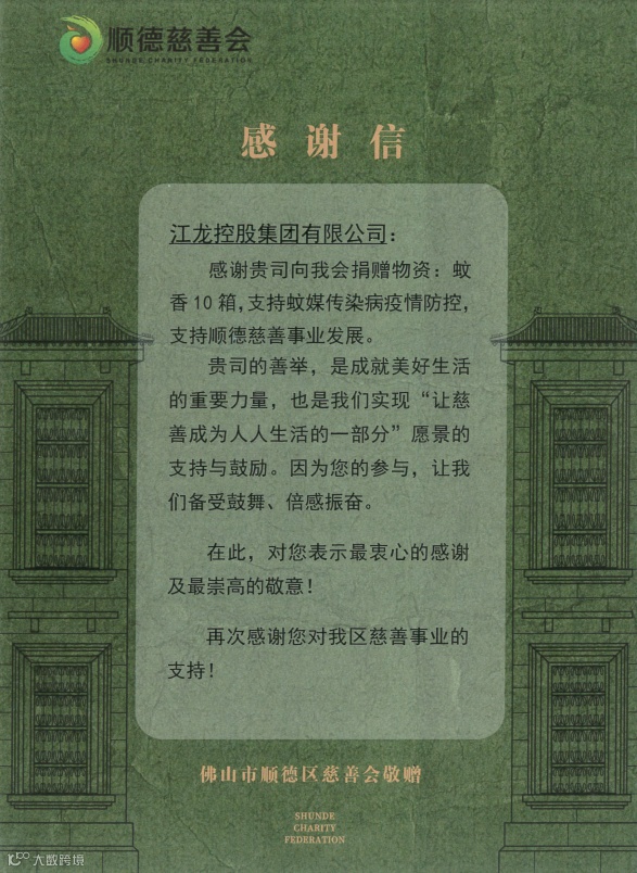 江龙集团此次捐赠,受到顺德区慈善会副秘书长黄勇华先生高度赞扬,并颁发了“感谢信”。