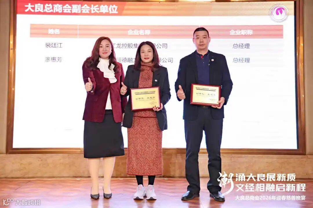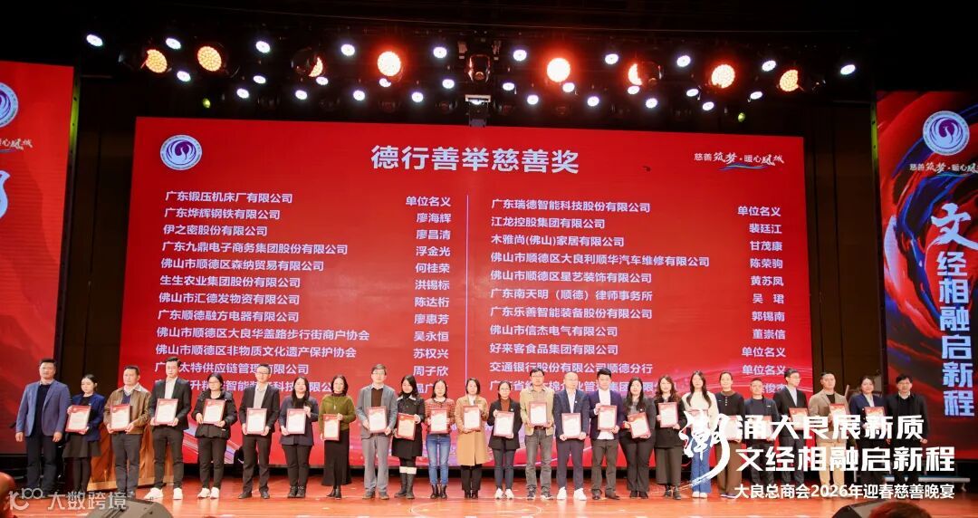 1月5日晚,顺德大良总商会2026迎春慈善晚宴隆重举行。在这场汇聚政商精英、爱心人士的盛会上,我司董事长凭借多年来在慈善领域的持续奉献,荣获大良总商会百千万工程慈善基金“德行善举慈善奖”,并获授顺德区大良总商会第三届理事会副会长牌匾。