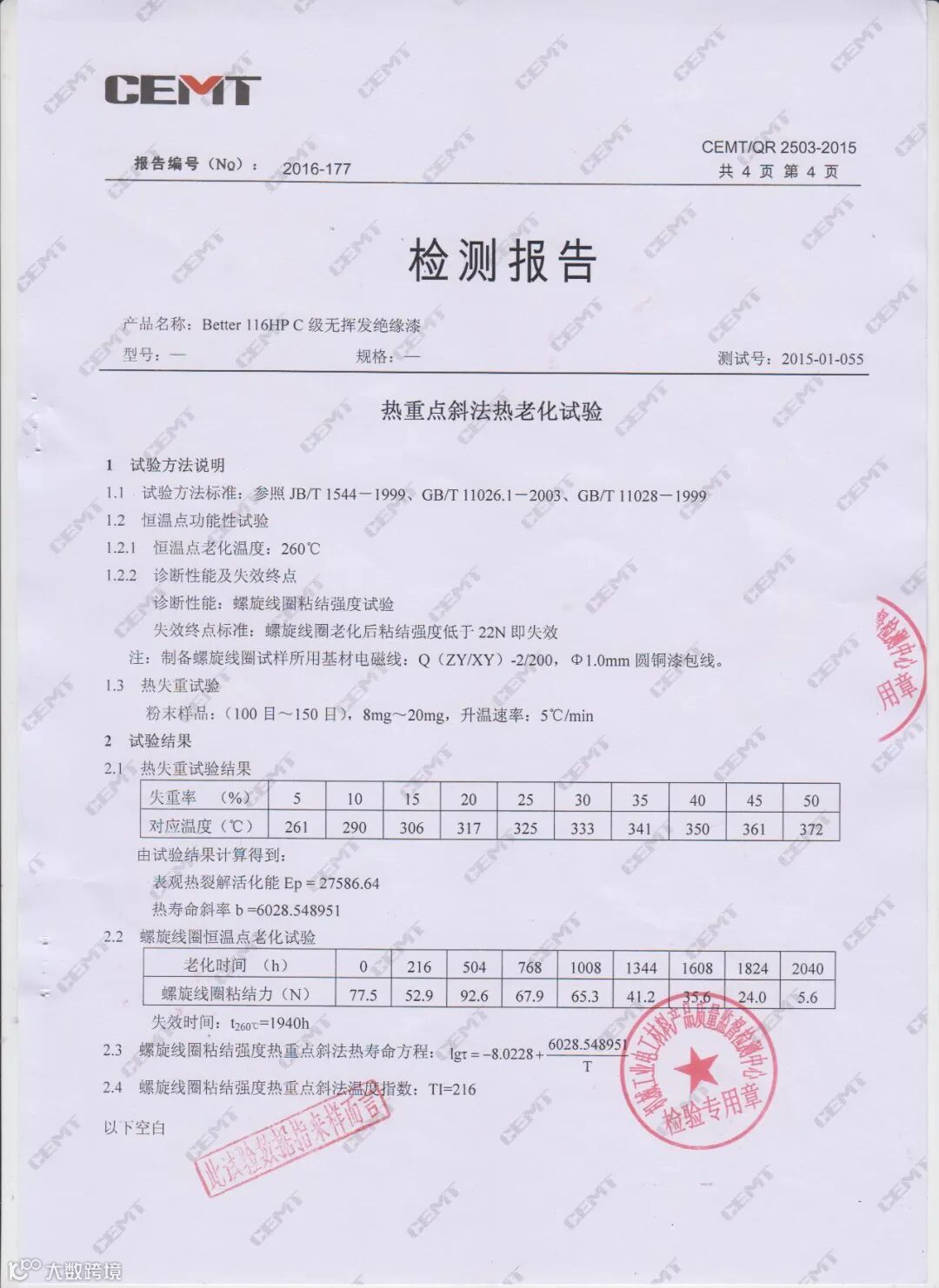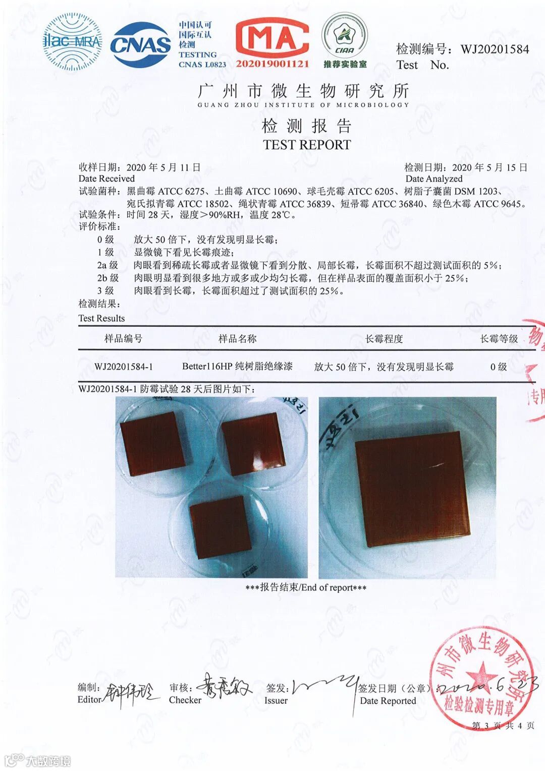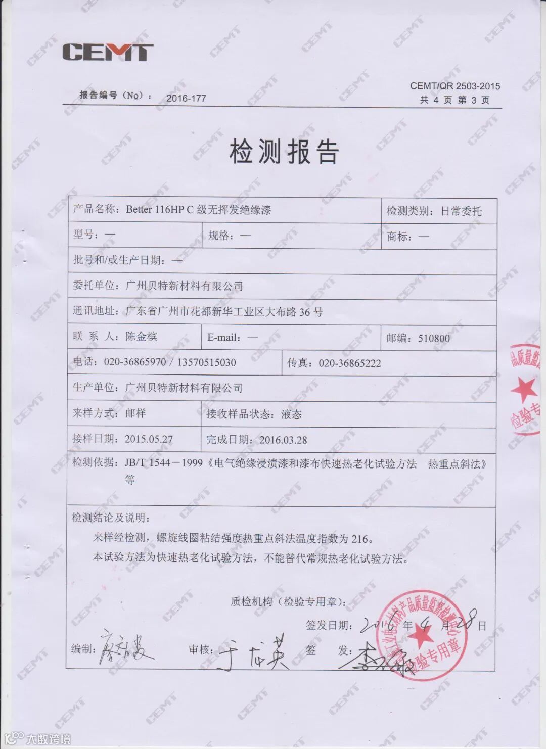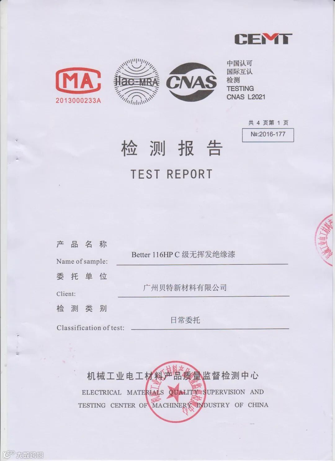 Better 116HU 无挥发绝缘树脂主要由环氧改性聚酯亚胺树脂、引发剂和无挥发活性稀释剂组成,该树脂单组分贮存、性能稳定、固化温度低、固化快,尤其具有无气味、固化挥发份少的特点,是新型的环保绝缘树脂,能满足国家最新的VOC排放要求。耐热等级为200℃。适用于包括新能源汽车电机在内的H、C级电机、电器的真空压力浸漆。