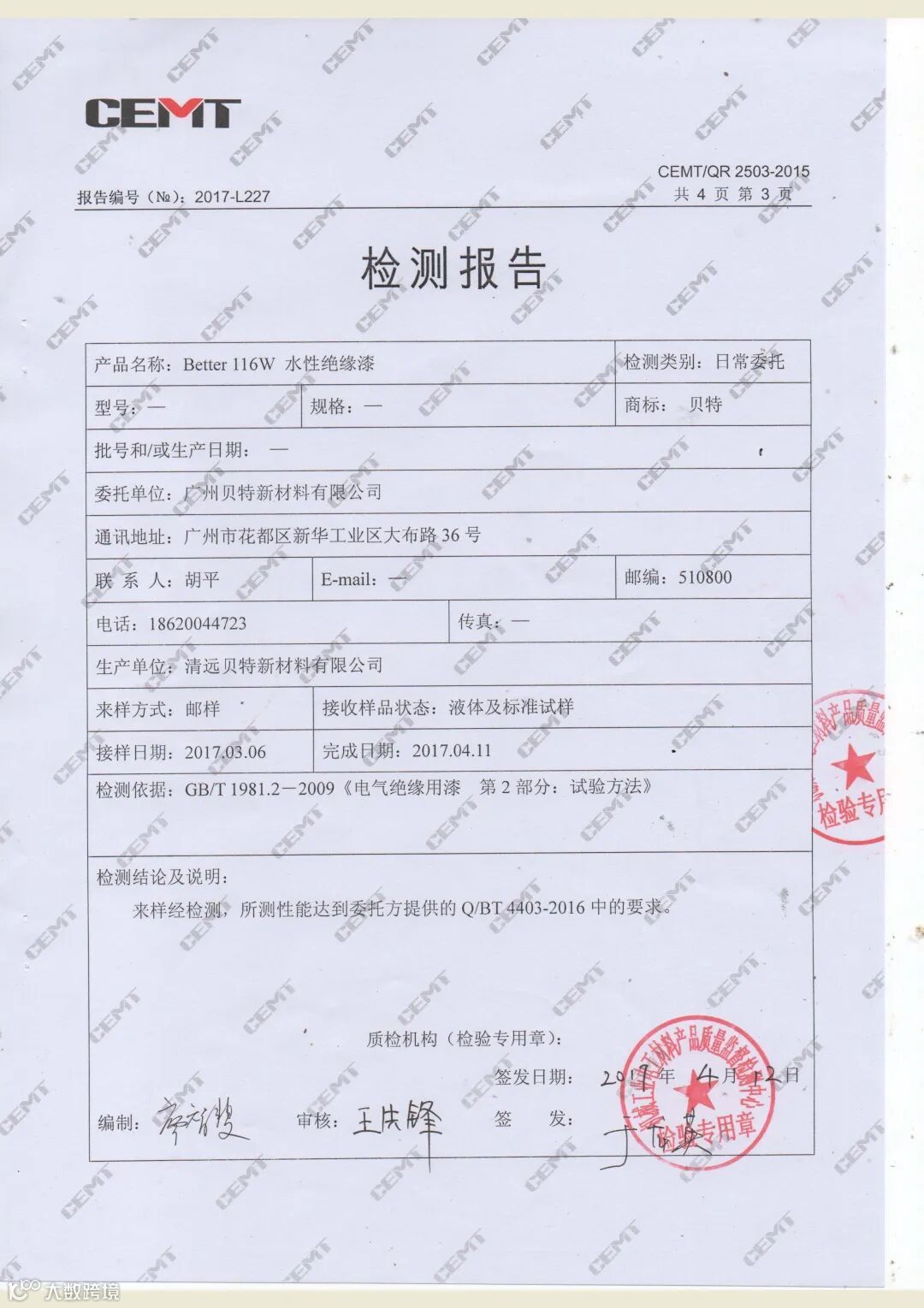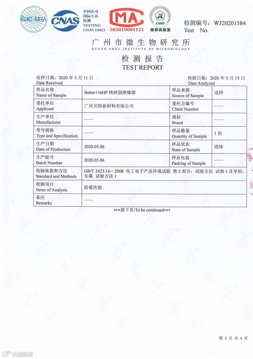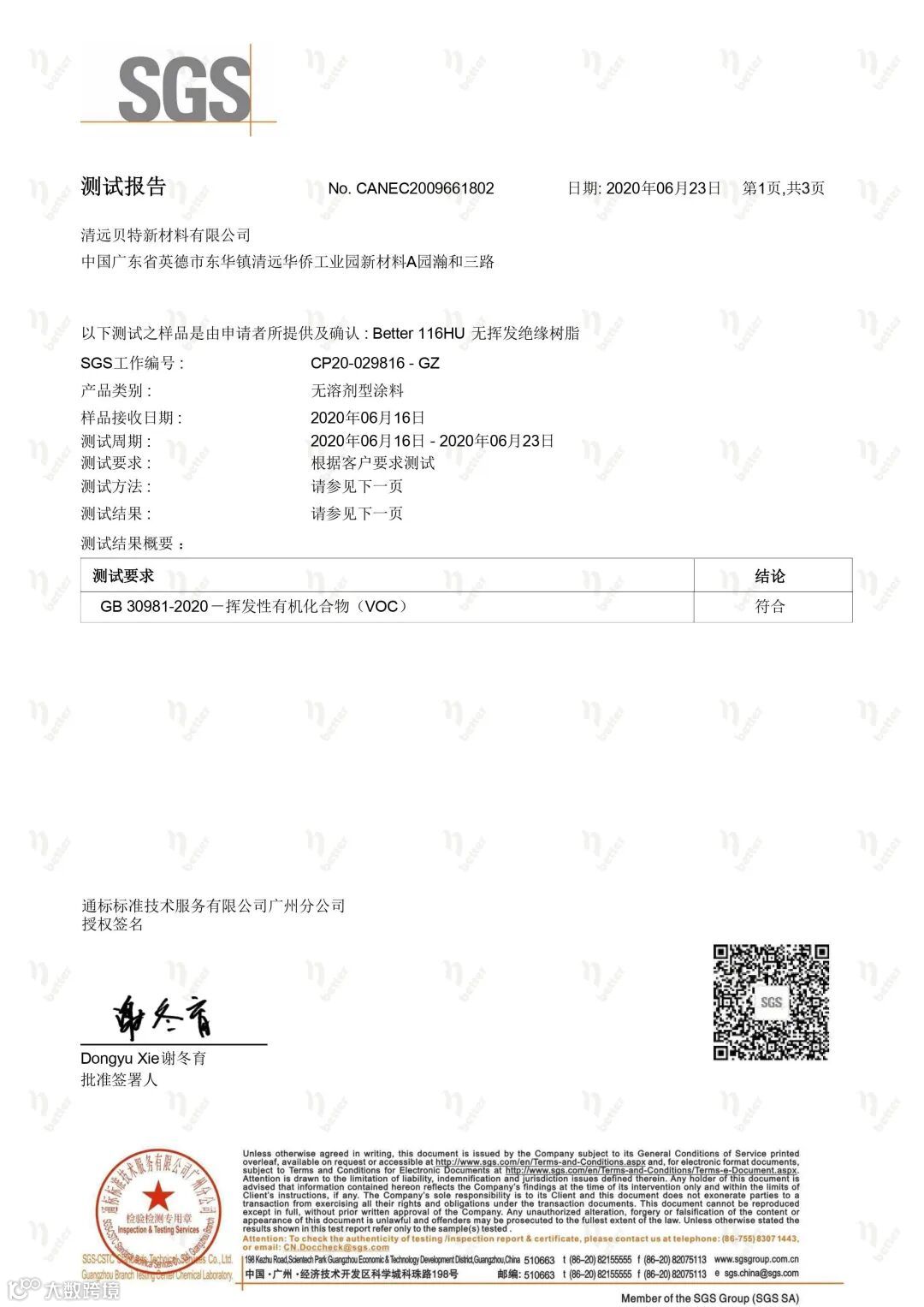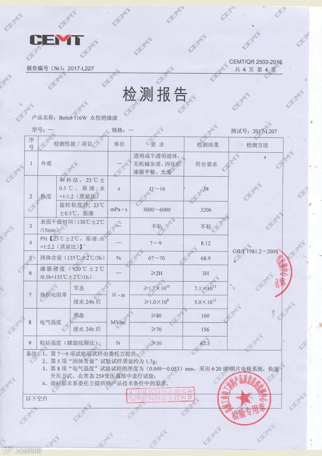 Better 116HU 无挥发绝缘树脂主要由环氧改性聚酯亚胺树脂、引发剂和无挥发活性稀释剂组成,该树脂单组分贮存、性能稳定、固化温度低、固化快,尤其具有无气味、固化挥发份少的特点,是新型的环保绝缘树脂,能满足国家最新的VOC排放要求。耐热等级为200℃。适用于包括新能源汽车电机在内的H、C级电机、电器的真空压力浸漆。