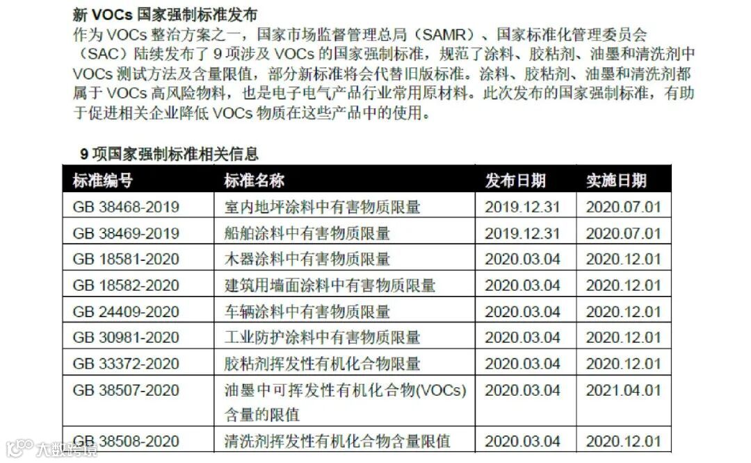 2018年7月3日,中华人民共和国国务院发布《打赢蓝天保卫战三年行动计划》,加快改善环境空气质量。该计划提出实施VOCs专项整治方案,包括制定石化、化工、工业涂装、包装印刷等VOCs排放重点行业和油品储运销综合整治方案,重点区域禁止建设生产和使用高VOCs含量的溶剂型涂料、油墨、胶粘剂等项目,开展VOCs专项执法行动等,目标2020年VOCs排放总量较2015年下降10%以上。