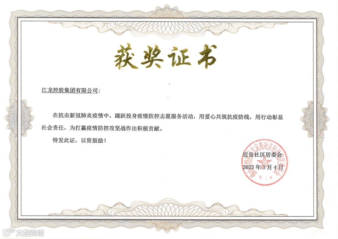 去年疫情突如其来,江龙控股集团有限公司以实际行动展现了“一方有难、八方支援”的大爱情怀,疫情期间向顺德区大良街道近良社区提供义工支援服务以及抗疫物资。用奉献诠释了守望相助、攻克时艰的社会责任和担当,对战胜疫情有了坚定的信心和决心。大良近良居委会特此颁发证书,以资鼓励。江龙控股集团很荣幸获得此奖。