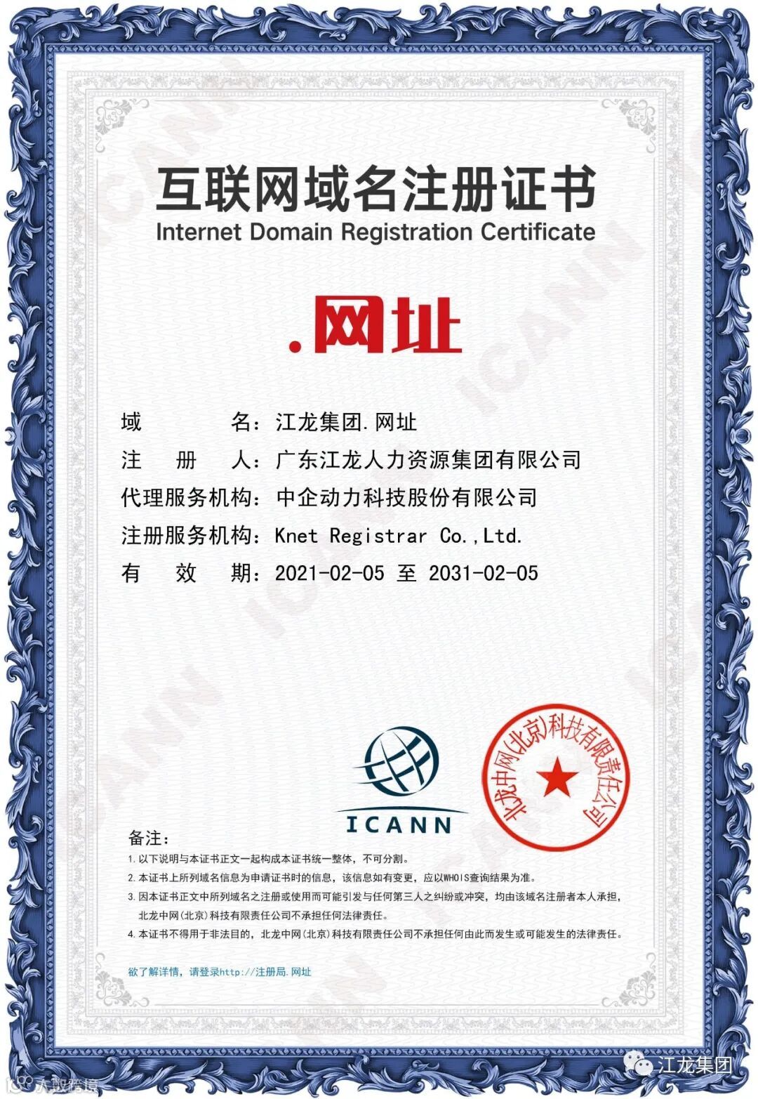2021年3月好事连连,江龙集团又成功注册了2个中文汉字域名,即日起打开任意浏览器输入“中国江龙.网址”和“江龙集团.网址即可进入广东江龙人力资源集团有限公司官网
