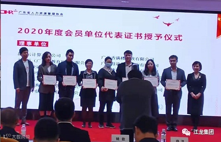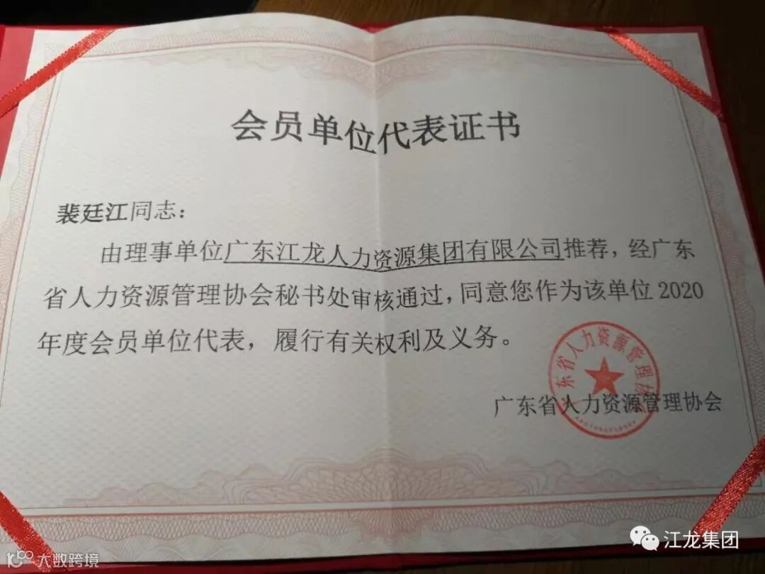 江龙集团裴廷江先生荣获“广东省人力资源管理协会(省人协)理事单位会员代表,裴董作为制造行业的优秀劳务供应商代表,作为劳务行业人力资源行业优秀人员代表入围,荣获此项殊荣,江龙集团在裴廷江董事长的有力指挥和带领下为制造行业的发展和促进立下了汗马功劳。