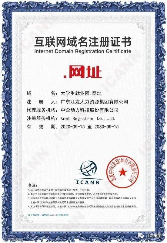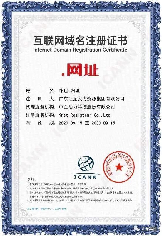 2020年9月好事连连,江龙集团又成功注册了2个中文汉字域名,即日起打开任意浏览器输入“大学生就业网.网址”和“外包.网址即可进入广东江龙人力资源集团有限公司官网。