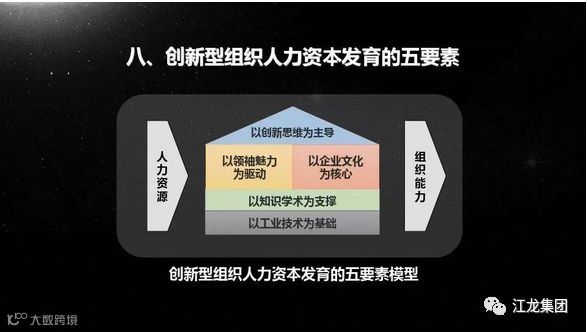 总结:目标是最右侧的提升组织能力。五个要素来实现:主导是创新思维,驱动力是领袖魅力,核心是企业文化,支撑是知识学术,基础是掌握和应用技术。发起点是人力资源管理理论和应用。