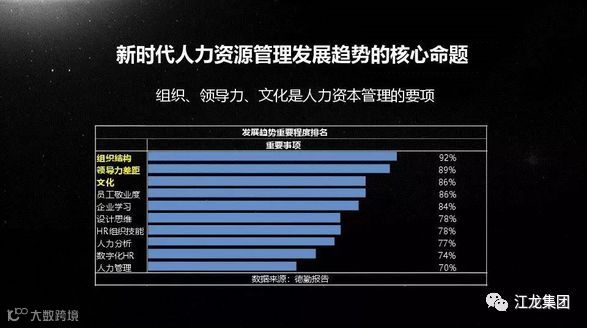 通过上图德勤报告的统计,我们可以看到,组织结构、领导力差距和文化三项排名是目前发展趋势中人资管理的最重要三项。