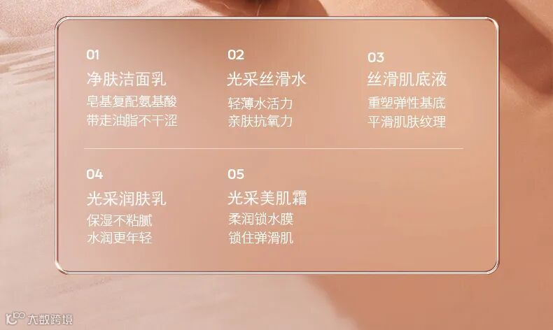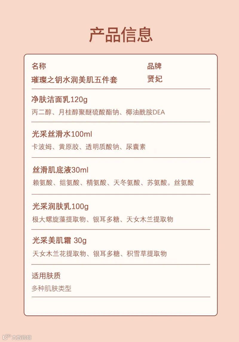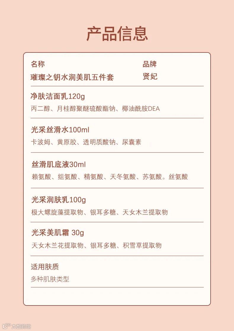 洗面奶120g 润肤水100ml 润肤乳100g 美肌霜30g 肌底液30ml