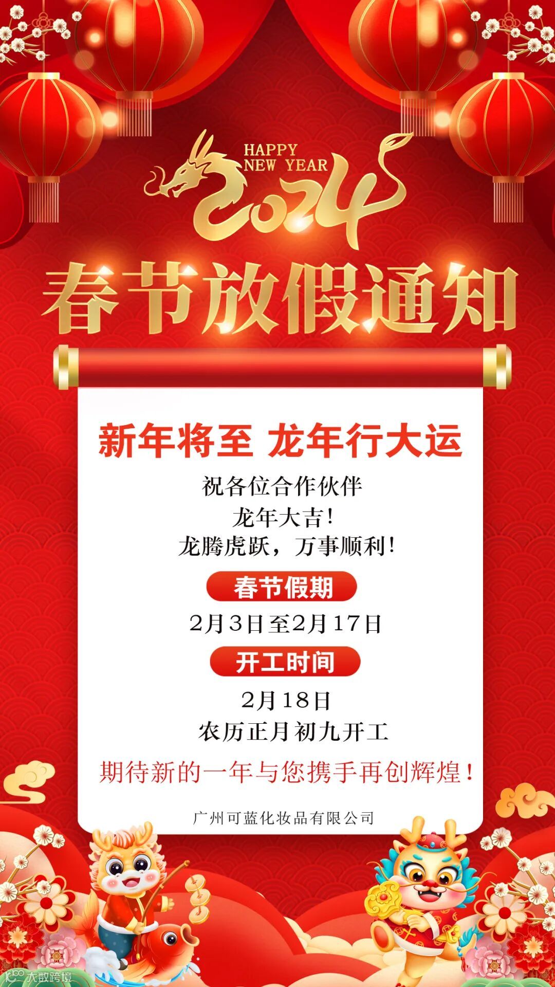 导读:🎈春节放假通知🎈͏ 2024年春节放假如下👇2月3号至2月17日在此,广州可蓝化妆品有限公司🦋预祝