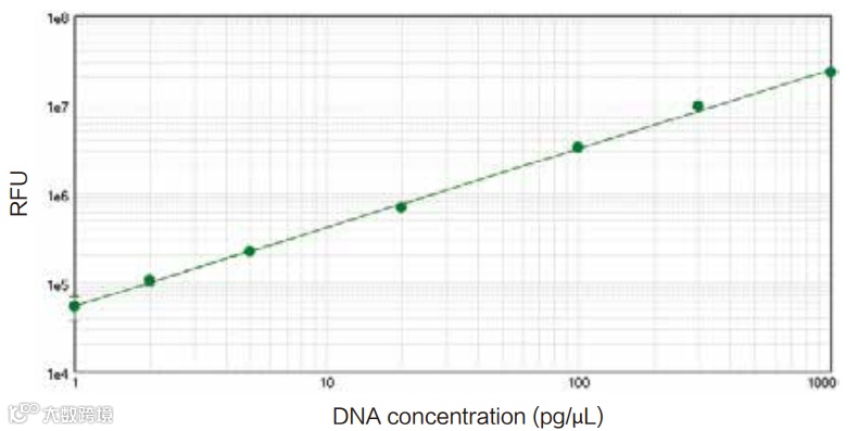 基于 SpectraDrop 微量检测板检测的 dsDNA 标准曲线图。dsDNA 的检测下限为每孔 5pg 或 2.5 pg/µL。R 方值大于 0.999。