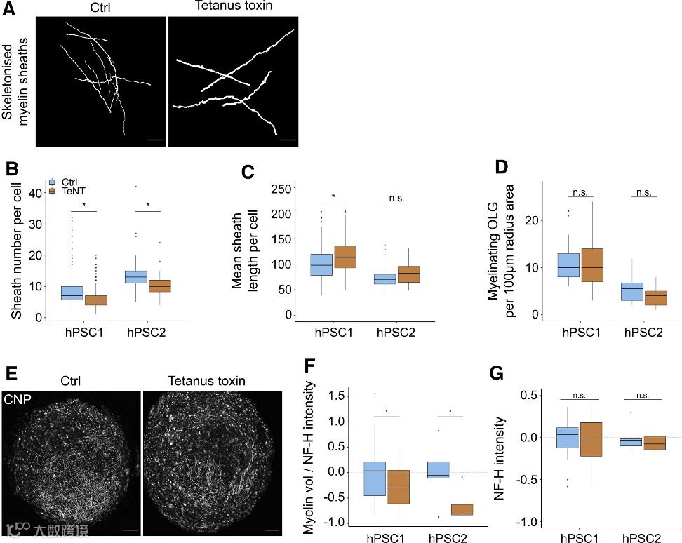 可见,TeNT 处理可以抑制髓鞘类器官的髓鞘生成,体积降低的同时 NF-H 保持不变,可见 TeNT 对髓鞘的影响不是来源于对轴突发育的影响。