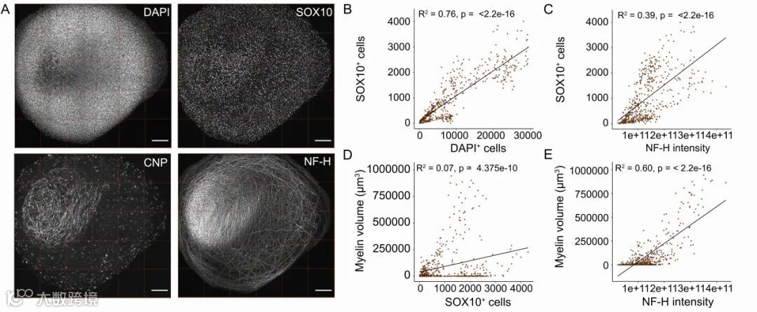 A:有代表性的 DAPI, SOX10, CNP 和 NFH 染色的同一个 MI-12 类髓鞘的图像. B-D:相关图像定量数据。