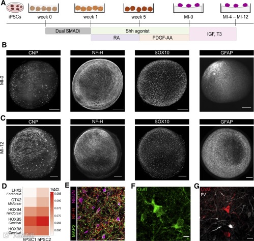 (A) 生成脊髓图案类器官的方案示意图。(B) CNP +少突胶质细胞、NF-H +轴突、SOX10 +少突胶质细胞和 GFAP + MI-0 星形胶质细胞的代表性图像。(C) CNP +少突胶质细胞、NF-H +轴突、SOX10 +少突胶质细胞和 GFAP + MI-12 星形胶质细胞的代表性图像。(D) qRT-PCR 衍生的 MI-0 类器官中延髓和尾部基因表达评估的热图。(E) 分别通过 MAP2、NF-H 和 NEUN 对神经元树突、轴突和细胞体进行免疫染色。(F) ChAT +运动神经元的免疫染色。(G) ChAT 和小清蛋白 (PV) 的免疫染色显示不同神经元亚型的分化。