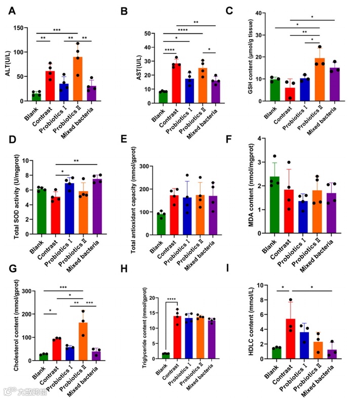 Fig. 3(A) Blood ALT content in mice; (B) mouse blood AST content; (C) liver GSH content; (D) total liver SOD content; (E) total hepatic antioxidant capacity; (F) MDA content in the liver; (G) liver cholesterol content; (H) hepatic triglyceride content; (I) liver HDLC content outcomes are stated as mean ± SD, *p < 0.05, **p < 0.005, ***p < 0.001, ****p < 0.0001.