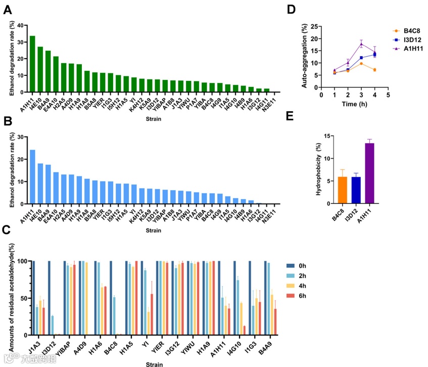 Fig. 2 (A) Degradation rate of 10% vol ethanol by strains; (B) degradation rate of 20% vol ethanol by the strain; (C) residual rates of acetaldehyde at different time points; (D) strain hydrophobicity; (E) strain self agglutination ability.