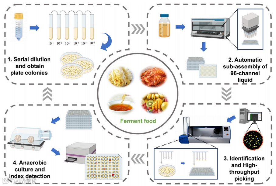 Fig. 1 High-throughput screening process: 1. acquisition of single colonies; 2. automatic sub-assembly of 96-channel liquid; 3. identification and high-throughput picking; 4. anaerobic culture and index detection.