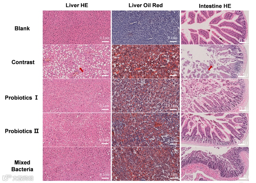 Fig. 4 Mouse liver HE sections (left); oil red O sections (middle); mouse small intestine sections (right) (magnification ×200).