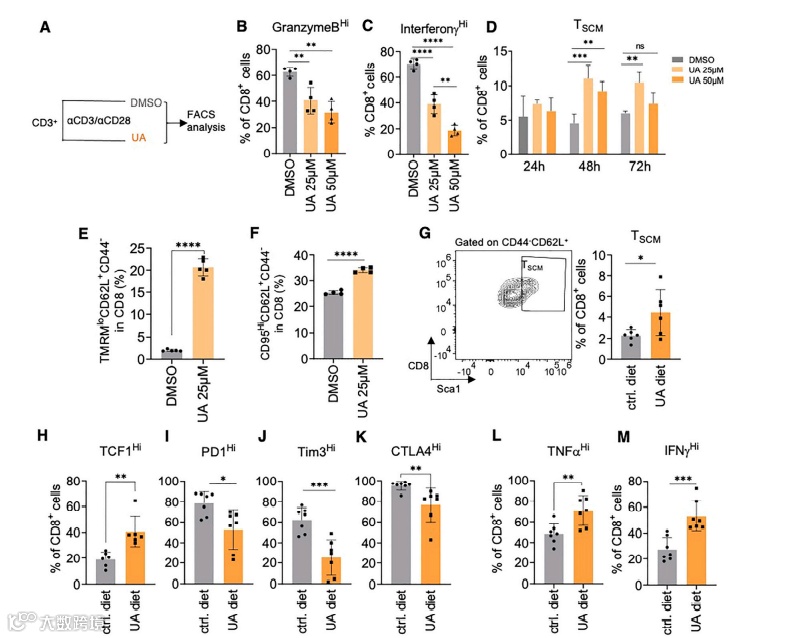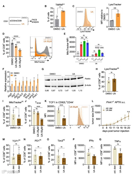 研究者们进一步证实,在给 CD8+ T 细胞服用 UA 后 6 小时内,线粒体膜电位降低(图 4A 和 4B)。这伴随着增强的溶酶体形成(图 4C), 24 小时后,线粒体含量以剂量依赖性的方式丢失(图 4D)。后者可以在所有分析的 T 细胞亚群中检测到,因此提示有丝分裂的诱导。图 4 的其他数据也有力地支持了 UA 诱导的依赖于 Pink1 的自噬触发 TSCM 的形成以增强抗肿瘤免疫的观点。