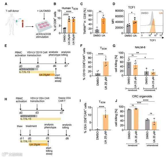 最后,研究者们希望确定UA是否会导致人类 CD8+ T 细胞中 TSCM 细胞的扩增。从健康献血者的外周血单个核细胞(PBMCs)中分离出人 CD3+ T 细胞,并在 UA 存在的情况下体外用 αCD3/αCD28 珠刺激它们。事实上,在 5 / 5 个人供体中,UA 增加了基于 CD45RA+CCR7HiCD62L+CD95+CD8+ 表达的人类 TSCM 细胞的频率(图 6B;图 S5A 和 S5B)。与小鼠 T 细胞一样,UA 处理 48 小时后,人 CD8+ T 细胞显示出线粒体膜电位下降(图 6C),细胞内染色证实 TCF1 表达增加(图 6D),证实 UA 诱导小鼠和人 T 细胞的记忆干细胞特征。为了确定 UA 引发的自噬是否也构成了诱导 CAR-TSCM 的可行策略,在存在或不存在 UA 的情况下,激活的 T 细胞通过慢病毒载体(VSV-LV)转导 CD19-CAR 基因。转导后 3 天,测定 CAR - 表达 TSCM 的数量(图 6E)。UA 不影响基因传递到 CD8+ 细胞;然而,尽管在 UA 暴露后, CAR- 表达的 TSCM 细胞显著增加,约占 CD8+ 细胞的 60%(图 6F),但这对 CD19 CAR- T 细胞介导的 NALM-6 白血病细胞杀伤没有负面影响(图 6G)。即使将 UA 应用于先前冷冻的癌胚抗原特异性 CAR - T 细胞(CEA;图 6H),这种强烈增强的 CAR - TSCM 形成(图 6I)与表达 CEA 的人类 CRC 类器官的杀伤效果相当(图 6J)。因此,UA 显著增强 CAR- TSCM 细胞的增殖。在 CAR T 细胞杀伤实验中,采用了 Molecular Devices 公司的 SpectraMax iD3 酶标仪的发光模式进行了数据读取。