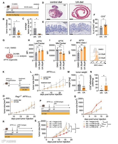 为了研究 UA 依赖性自噬是否模仿了 Stat3△IEC 小鼠的效果,并以 T 细胞依赖性的方式阻止了肠道肿瘤的发展,研究者们采用了氧化偶氮甲烷 (AOM)诱导的肿瘤发生模型。FVB 小鼠每周注射一次致癌物 AOM,持续 6 周,并以含 UA 的饲料(2.28 g/kg)或对照饲料喂养 18 周(图 1A)。口服 UA 可显著降低肿瘤发生率和肿瘤大小(图 1B-1D)。随之而来的是 CD3+ T 细胞浸润到结肠黏膜的增多(图 1E 和 1F)。结合肿瘤类器官 APTK 类器官 (characterized by loss of Apc,Trp53,and Tgfbr2 as well as expression of oncogenic KrasG12D)系统实验 ,证实了 UA 诱导的肿瘤抑制依赖于 T 细胞。