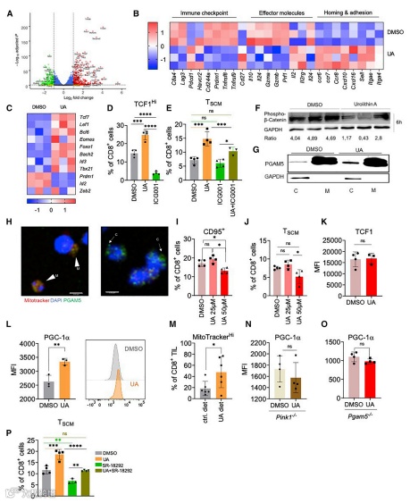 研究者们共鉴定出 1178 个差异表达基因,其中 765 个表达上调,413 个表达下调(图 5A)。UA 治疗降低了免疫检查点和效应分子编码基因的表达,而增强了 Cd27、Ccr7 和粘附基因的表达(图5B),这是干细胞样 CD8+ T 细胞的一个特征。另外,研究了观察到的 TCF1 上调是否是 Wnt 信号增强的结果。根据这一概念,观察到几个 Wnt 靶基因的转录增加(扩展数据图 4B)。此外,UA 在 6 小时后已经导致 β-连环蛋白磷酸化显著下降(图 5),表明 Wnt 信号的激活早于转录因子的改变。图其他结果表明 UA 通过 Wnt 依赖的 PGC-1a 上调来驱动 TSCM 的形成,这是由 Pgam5 在自噬反应中的囊内释放所促进的。